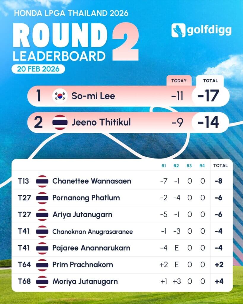 สำหรับตำแหน่งผู้นำวันที่ 2 ได้แก่ โซมี ลี มืออันดับ 38 ของโลก วัย 27 ปี จากเกาหลีใต้ หลังจากที่วันแรกมี 6 อันเดอร์พาร์ (66) อยู่อันดับ 3 ร่วม แต่ในรอบสอง โซมี ลี กด 11 อันเดอร์พาร์ 61โดยทำ 9 เบอร์ดี้ใน 14 หลุมแรกก่อนจะมาทำอีเกิ้ลในหลุม 15 และไม่เสียโบกี้เลย รวม 2 วัน 17 อันเดอร์พาร์ 127 (66-61) ขึ้นเป็นผู้นำวันที่ 2 โดย จีโน่-อาฒยา ฐิติกุล ตามอยู่ 3 สโตรค